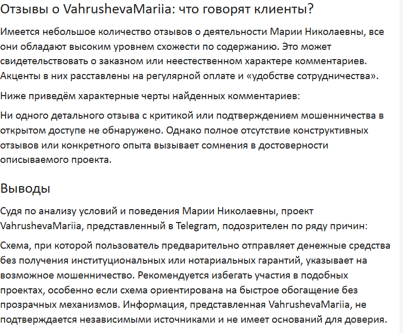 Существуют фейковые положительные отзывы о деятельности Марии Николаевны, которые размещаются в социальных сетях, где они повторяют один и тот же текст о стабильных выплатах за 7 месяцев без деталей опыта.
