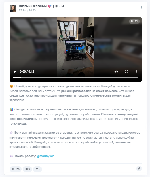 Исходя из публикаций, можно понять, что автор работает на криптовалютной бирже и торгует на спотовом рынке. В качестве подтверждений успеха Мария показывает скрины с отчетами о выплатах. Проверить их невозможно, так как отсутствуют публичные ссылки на кошельки инвестора.
