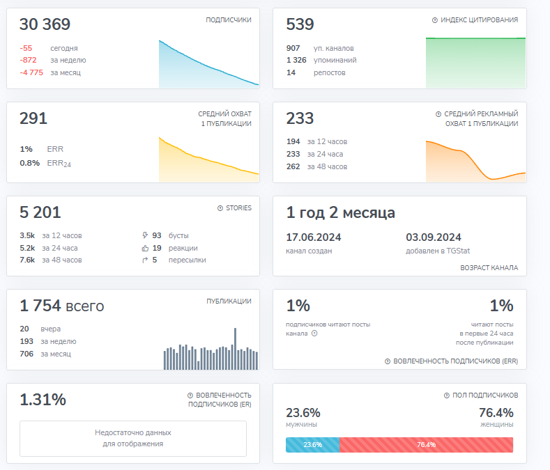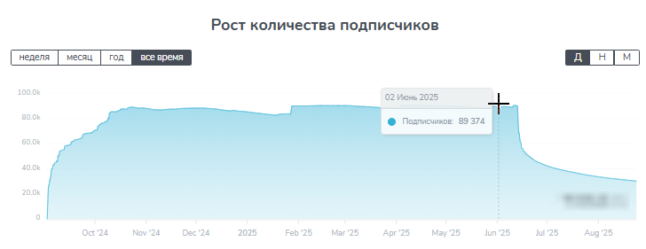 Подписчиков привлекали через рекламу и накрутку. Обнаружено около 2 000 упоминаний в рамках других ресурсов. Еще недавно на канал было подписано почти 90 тысяч человек. При этом всего 1% от аудитории просматривает публикации.
