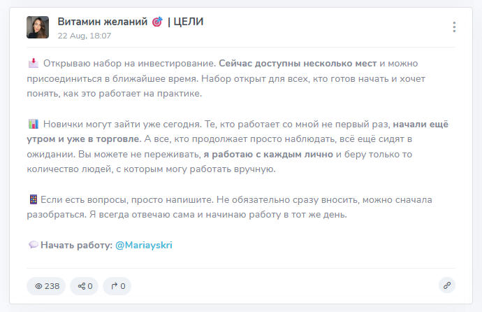 Mariayskri проводит набор в команду для совместного инвестирования. Клиенту предлагают перевести деньги, чтобы Мария использовала их для торговли. Полученную прибыль делят в заранее оговоренном соотношении.