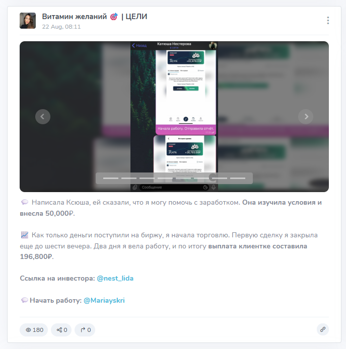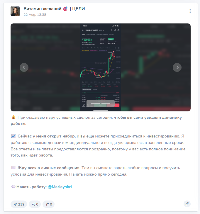 Ссылку на страницу @Mariayskri можно найти в публикациях. Инвестор предлагает подписчикам сотрудничать в формате раскрутки счета.