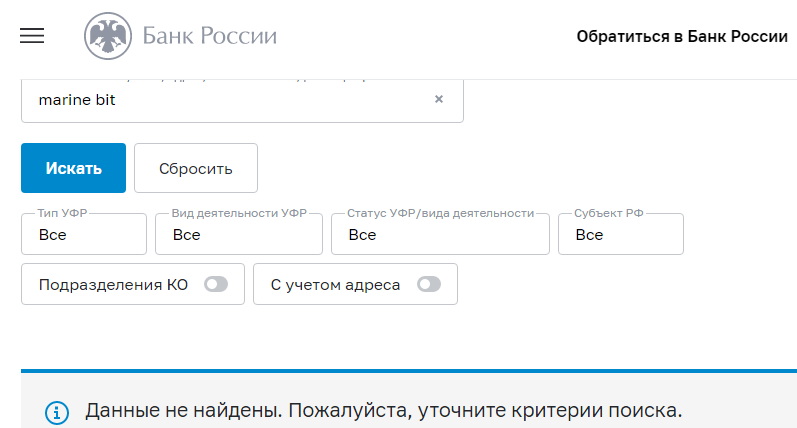 В соответствии с финансовым законодательством РФ, компания должна иметь лицензию Центрального Банка. Мы изучили реестр российской институции и не нашли сведений о регистрации в ней компании «Маринбит». Как мошенническая организация marine bit не маркирована.