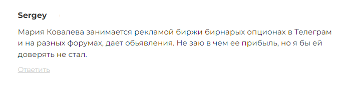 Пользователь по имени Сергей сообщил, что Мария занимается рекламой реферальной ссылки биржи бинарных опционов в Telegram и на форумах.