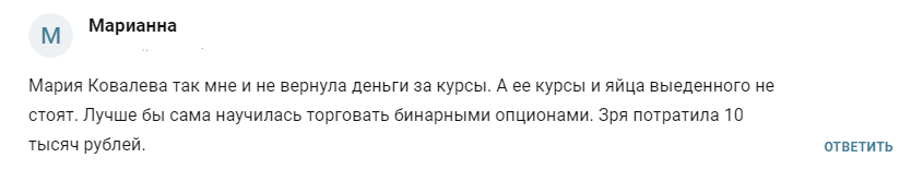 В период активной деятельности эта аферистка смогла собрать несколько негативных комментариев. Вот некоторые из них. Клиентка по имени Марианна пишет, что купила у Марии платный курс, но он оказался сомнительного качества. На просьбу вернуть деньги мошенница ничего не ответила.