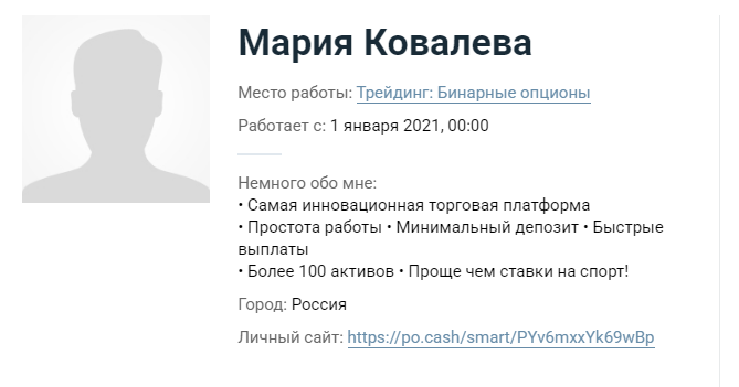 Сейчас уже сложно сказать, в чем конкретно заключался ее развод, об этом можно лишь догадываться. Сейчас ее ресурсы сохранились только в кешах серверов. Скорее всего, Мария продвигала биржу Po Cash и давала реферальную ссылку на нее. Клиент должен был зарегистрироваться, пополнить депозит и потерять все деньги, делая ставки на бинарных опционах. За это Ковалева получала награду в виде комиссионных.