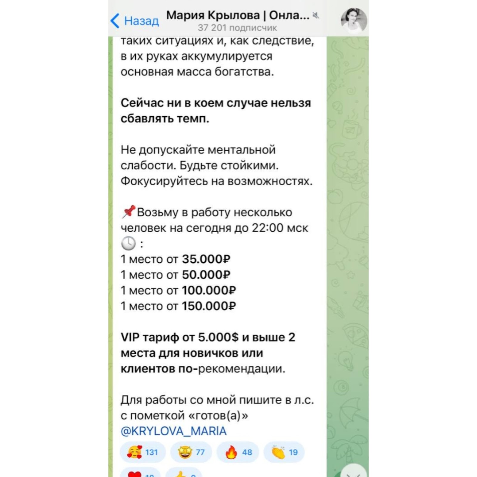 В Телеграмме можно ознакомиться с условиями сотрудничества. Трейдер сообщает о том, сколько мест выделяет на раскрутку. Автор проекта Krylova Marla принимает такие вложения: