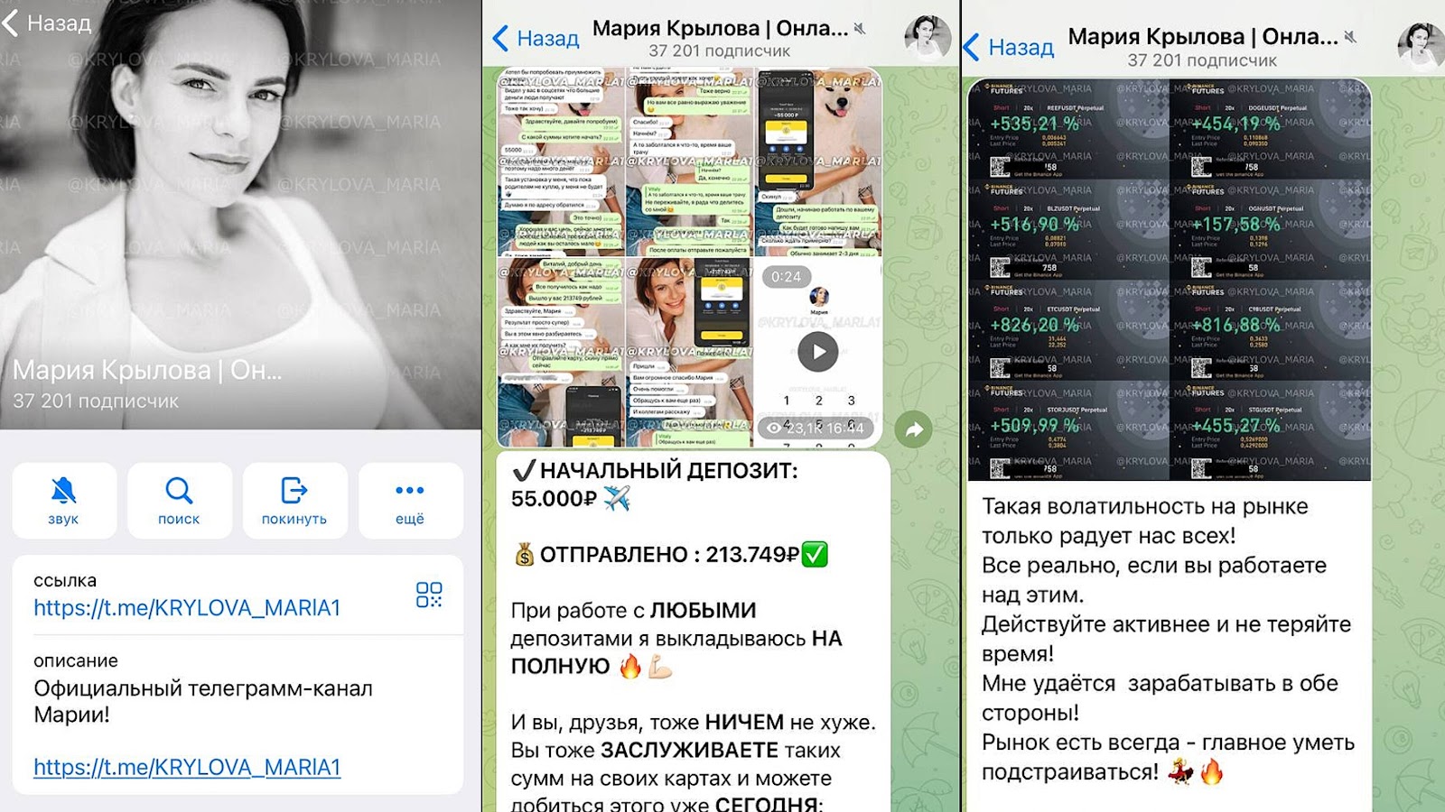 В Телеграмме девушка выкладывает актуальные предложения по раскрутке. Также демонстрирует скриншоты с выплатами клиентам. Такие материалы могут оказаться поддельными, поэтому доверять им не стоит. Мария Крылова публикует положительные отзывы, но в интернете есть противоположные. В паблике выкладываются мотивационные посты. В них трейдер пишет, что не переставала изучать схемы по торговле и благодаря этому вышла на высокий доход. Таким образом она призывает к сотрудничеству.