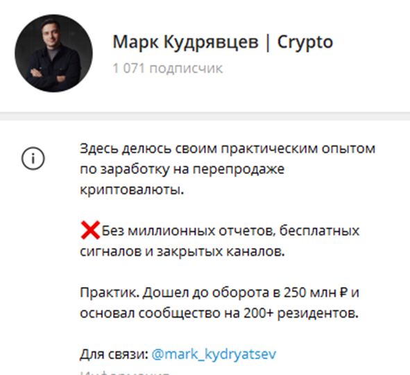 Деятельность Марка в качестве блогера сосредоточена в социальных сетях. Это телеграмм и “Яндекс Дзен”. Больше всего подписчиков в тг “Марк Кудрявцев Crypto” — чуть больше 1000 человек. Но накрутки нет, что говорит в пользу трейдера.
