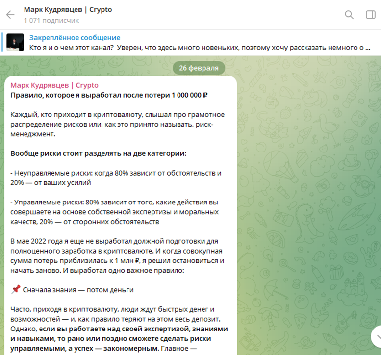 В чате Кудрявцев рассказывает о себе, коротко о своем пути и делится полезной информацией, касающейся арбитража. В одном из постов мужчина утверждает, что на канале не будет никаких мошеннических схем и продажи липовых курсов.