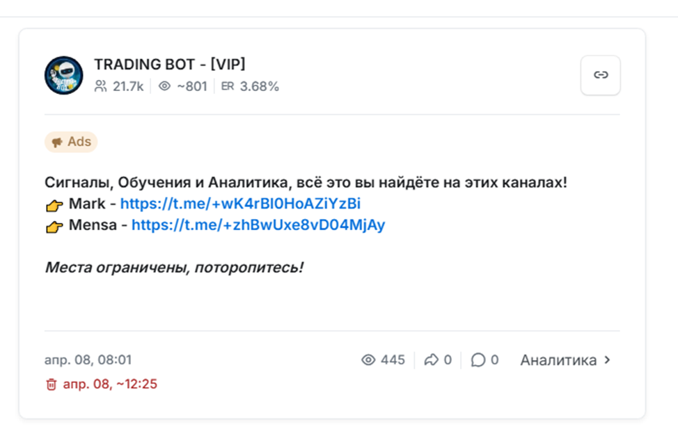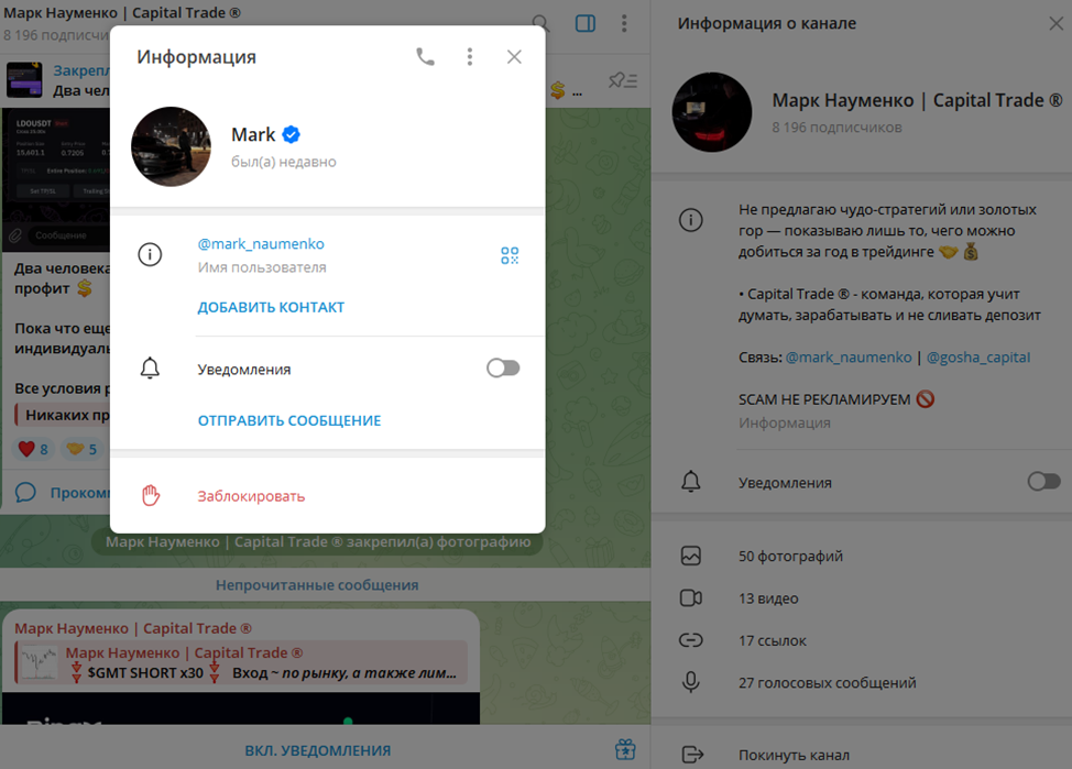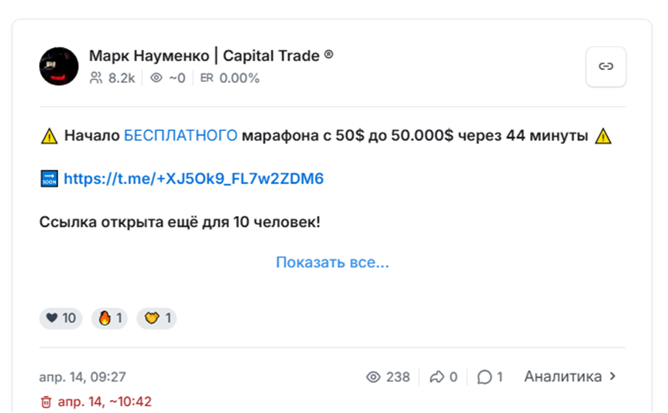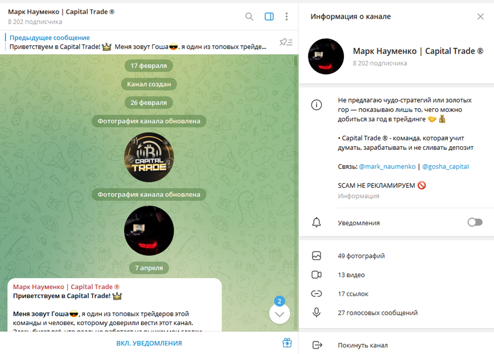 Проект Capital Trade работает только в Телеграме. Основной Тг с названием «Марк Науменко Capital Trade» за первую неделю работы собрал аудиторию в 8K человек. Подписчики приходят с рекламы с кликбайтным содержанием, а также с ботоферм. Иногда Марк и Гоша рекламируются вместе с другими каналами, вероятно входящими в единую сетку.