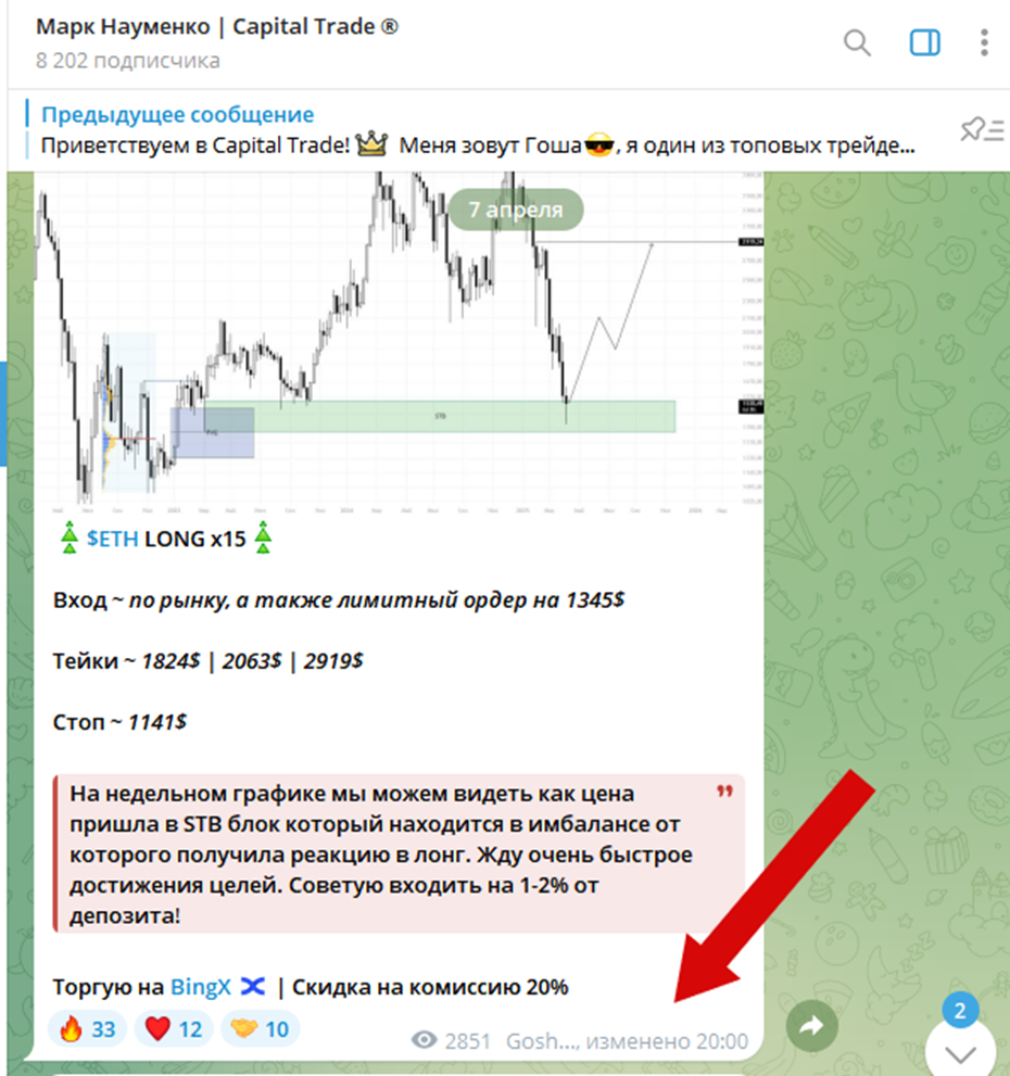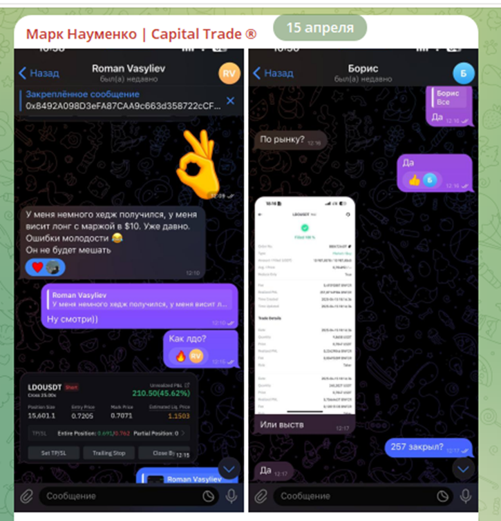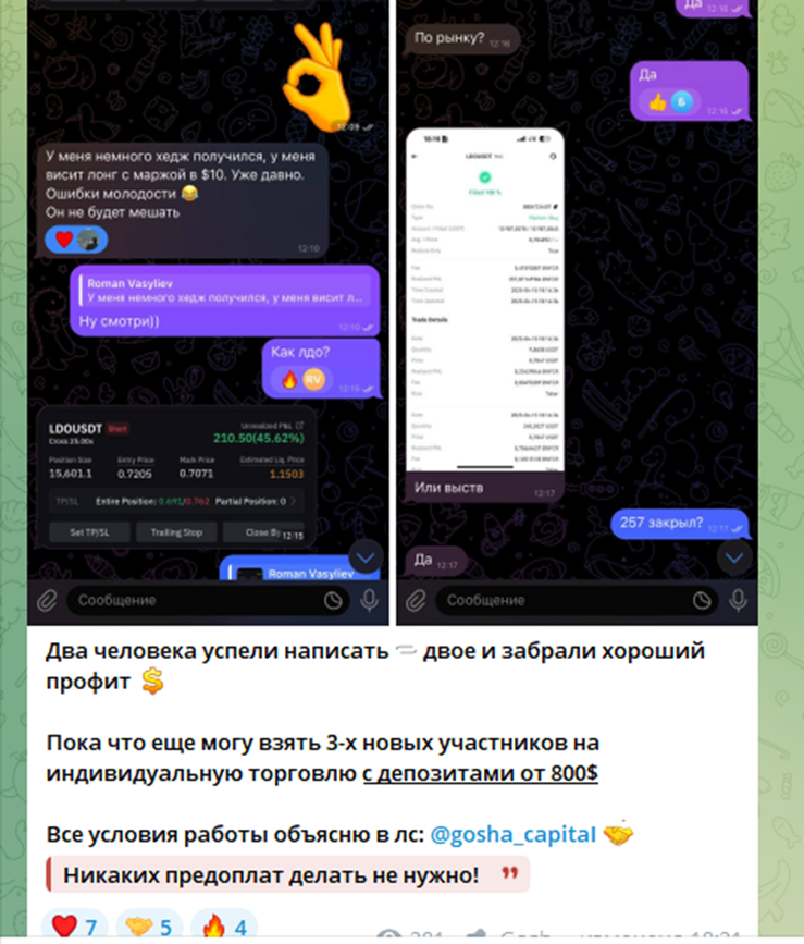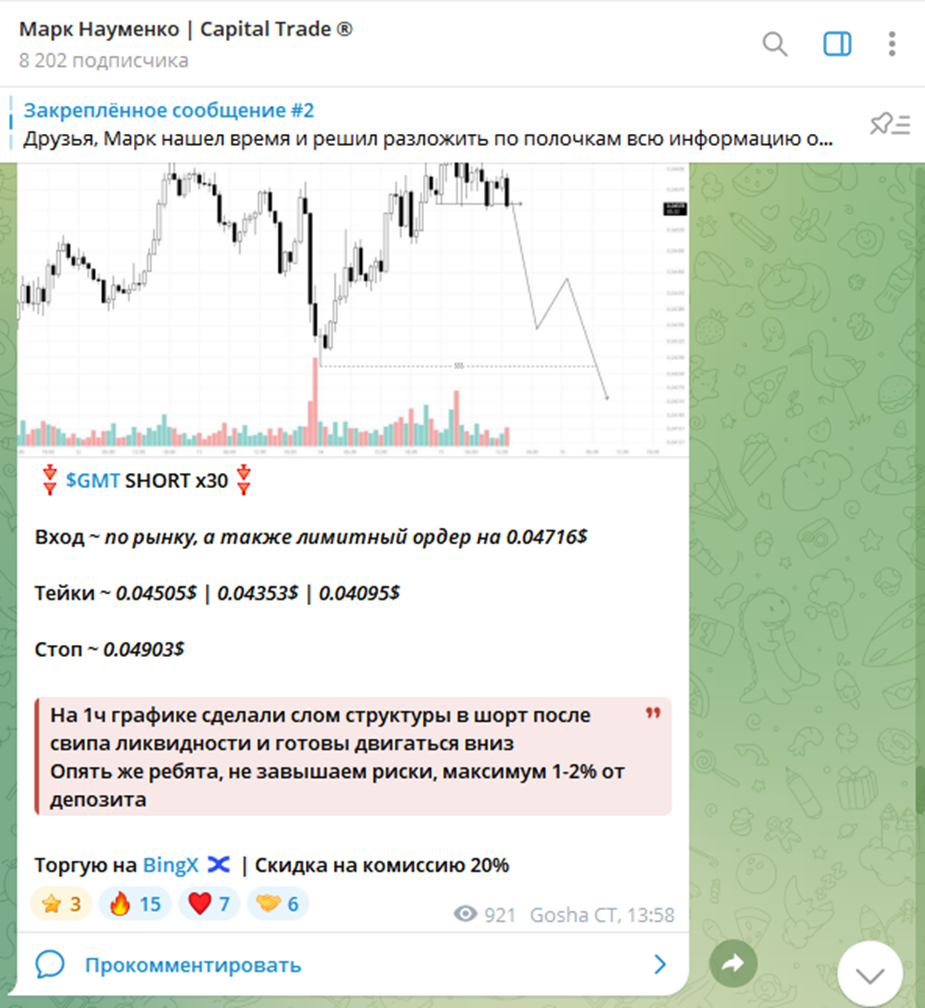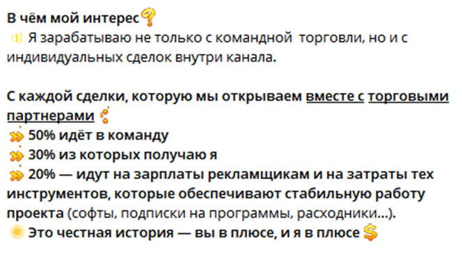 Трейдеры заявляют, что основной доход получают с командной торговли, а также с индивидуальных сделок внутри канала. За эксклюзивные сигналы, которые можно получить через личку Mark Naumenko или Gosha CapitaI, трейдеры просят 50% от прибыли.