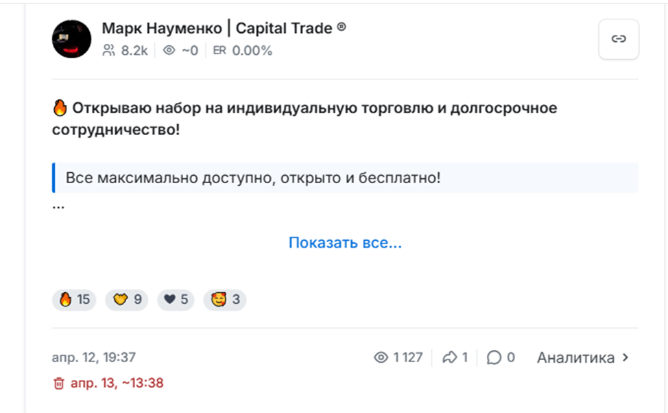 Телеграм-канал «Марк Науменко Capital Trade» начал активную деятельность 7 апреля 2025 года. На момент обзора проект работал неделю, но уже успел опубликовать пару десятков прогнозов и видеообзоров, демонстрируя феноменальную продуктивность.