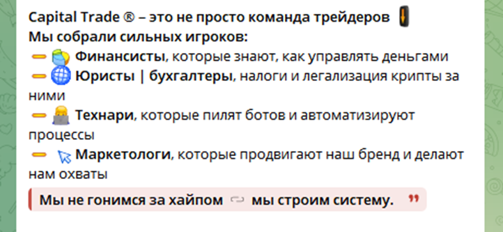Создатели Capital Trade Марк Науменко и Gosha CT заявляют себя опытными трейдерами, создавшими команду единомышленников. С их слов проект объединяет 30 профессионалов из разных сфер деятельности. Единые усилия трейдеров, инвесторов, финансистов, маркетологов, бухгалтеров, юристов и технарей, позволяют четко предугадывать рынок, аккумулируя прибыль с завидной стабильностью.