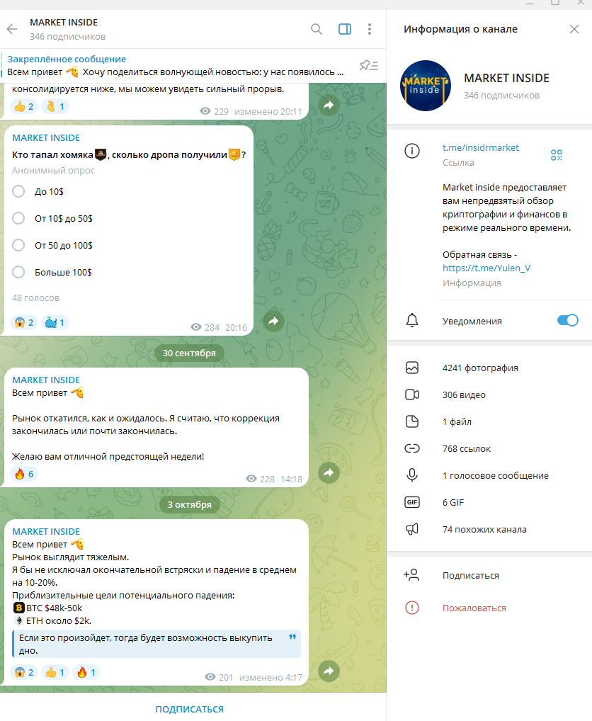 Маркет инсайд – канал в Тг, на котором размещаются обзоры криптографии и финансов от автора @Yulen_V. Какой-то информации о себе автор не предоставляет, как и не делится сведениями о своих компетенциях, образовании, торговых успехах. Рассмотрим деятельность проекта, оценим его актуальность и отзывы пользователей, чтобы понять: стоит ли доверять информации, размещенной на канале или это очередной бесполезный проект.
