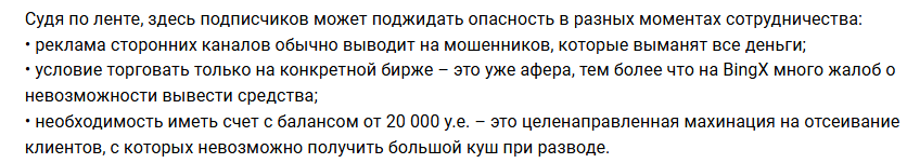 Рассказывая о плюсах этого приватного чата, автор публикаций прикрепляет скриншоты, в которых довольные пользователи делятся своей прибылью, однако узнать, сфабрикованы ли эти доказательства или нет, не получится.