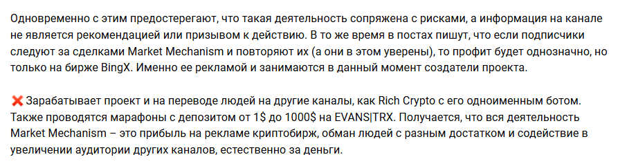 Канал старается продвигать собственный приватный канал, который кажется бесплатным, но на самом деле, чтобы получить к нему доступ, нужно сначала зарегистрироваться на бирже BingX с методом входа по реферальной ссылки, что дается в постах с инструкцией и внести депозит минимум на 100$. После этого, вы должны написать администратору mmechanism, который даст вам доступ к этой закрытой группе.