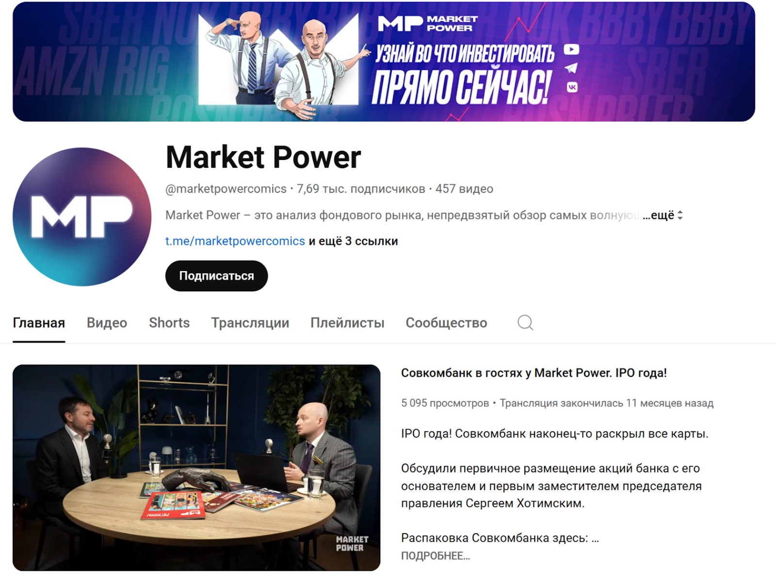 - Ютуб — marketpowercomics. Канал работает достаточно давно — еще с ноября 2021-го. На текущем этапе к нему подписано около 7.6 тыс. человек, число роликов — около 460, а просмотров — более 2.5 миллионов.