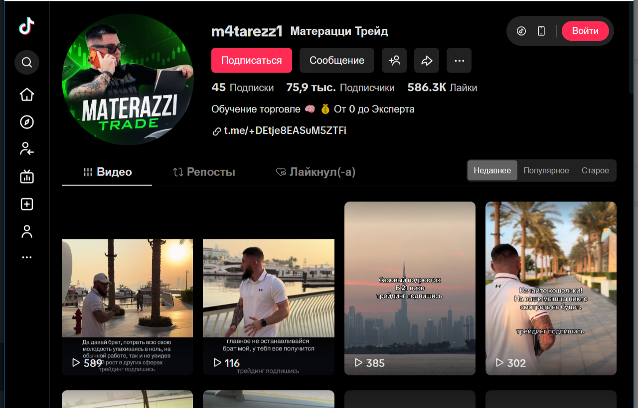 В качестве рекламного канала Андрей использует аккаунт m4tarezz1 в Тик-Токе. Блогер собрал более 50 тысяч подписчиков. Новые ролики выкладываются практически ежедневно. Никакой практической пользы они не несут. На видео демонстрируются дорогие машины, пачки денег. Все это сопровождается призывами перейти в Телеграм и стать частью команды.
