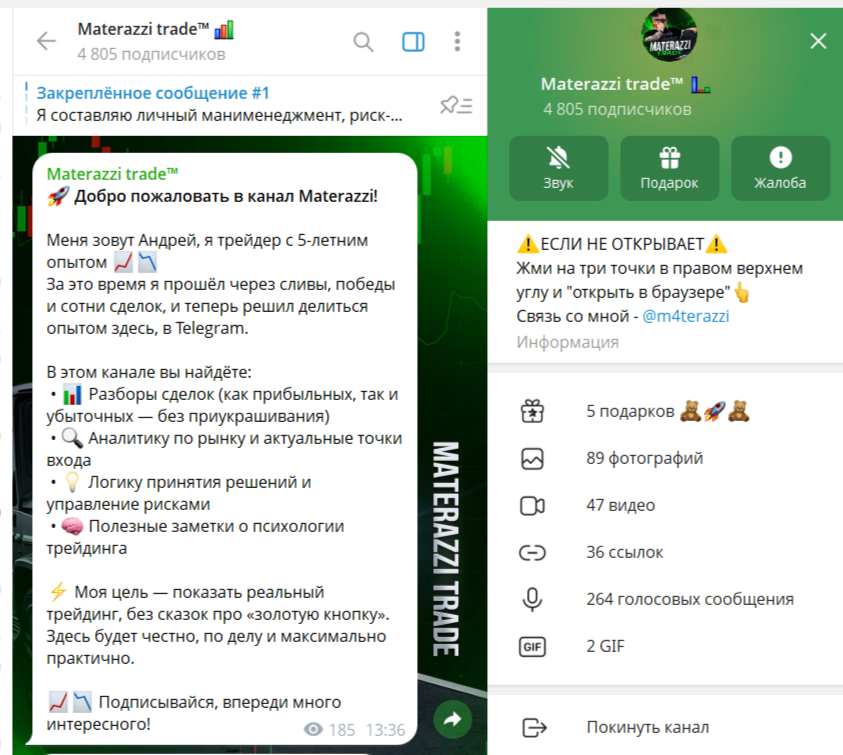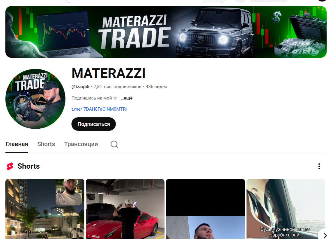 Главный медиа-ресурс – ТГ-канал Materazzi Trade. Сообщество создано в конце сентября 2025 года. Сейчас на аккаунт подписано около пяти тысяч человек. Однако, просмотры редко превышают несколько сотен. Комментарии закрыты. Выбор эмодзи ограничивается несколькими положительными картинками. Впрочем, даже здесь пользователи не проявляют активности. Все это может свидетельствовать об использовании накрутки.
