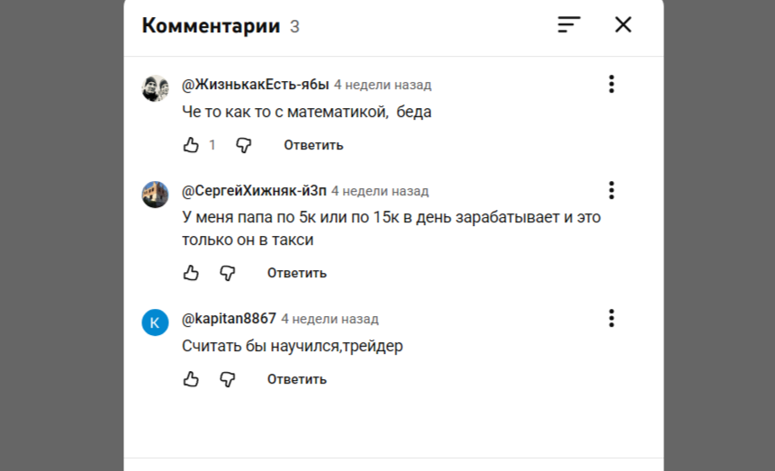 В интернете нет отзывов о результатах сотрудничества с трейдером. Судя по анализу социальных сетей, люди просто не интересуются предлагаемыми услугами. Мнение пользователей можно узнать только из комментариев. Подписчики иронизируют и откровенно смеются над трейдером.