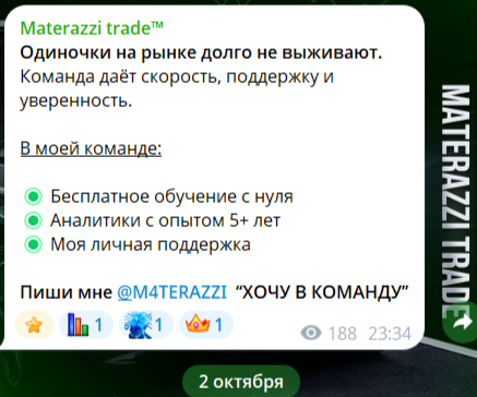 Как говорилось выше, полезного контента в проекте Materazzi Trade нет. Каждый пост направлен на привлечение пользователей в закрытый вип-канал. В начале автор предлагает обучение трейдингу с нуля, работу с профессиональными аналитиками и свою круглосуточную поддержку.