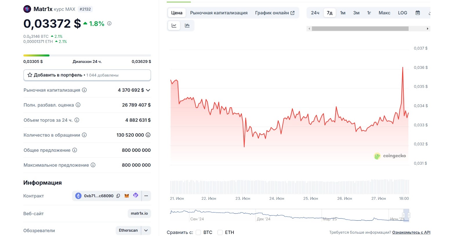 На июнь 2025 года цена MAX находится в сотых доллара США. По данным CoinGecko, она колеблется примерно в районе $0.03 (примерно 2.66 ₽), при этом курс постоянно меняется. Для сравнения, на своем историческом пике стоимость монеты достигала $0.47.