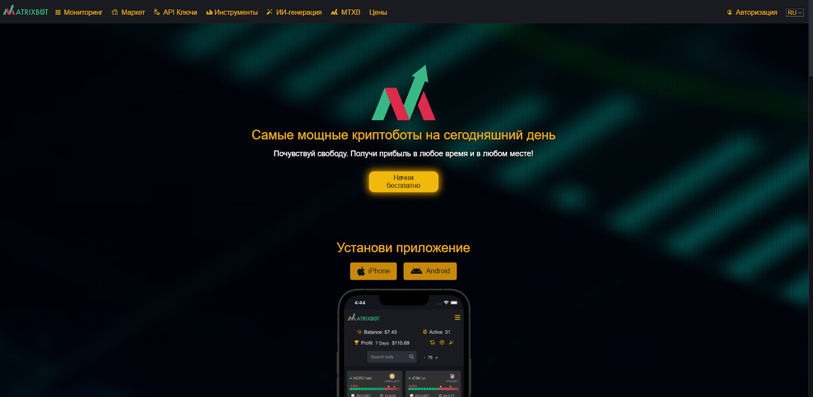 При входе на сайт Matrix Bots посетители видят небольшой лэндинг с презентацией проекта. Изначально весь текст на английском языке, но доступен перевод на русский. Основная суть услуг — платное создание специализированных ботов под различные задачи на финансовом рынке.