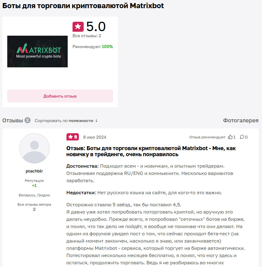 Чтобы сформировать более полную картину проекта, разберем и отзывы о MatrixBot, которые люди пишут в интернете на независимых сторонних платформах, не подверженных накруткам.