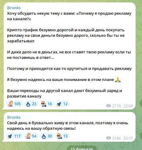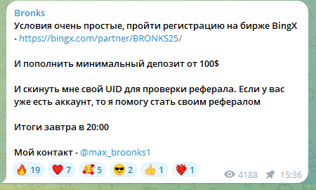 Спекулянт открыто пишет о том, что это лишь способ привлекать новых участников в проект. Якобы он обменивается с коллегами рекламными интеграциями. На самом деле это говорит о том, что Bronks не модерирует рекламу. А его ссылки ведут на каналы, где пользователи могут слить банк.