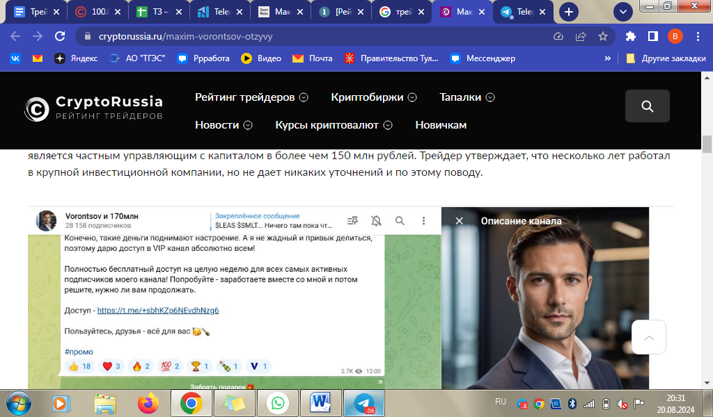 Можно предположить, что реклама – весомый процент в общей доходности Воронцова. Печально, что трейдоблогер не заботится о безопасности потенциальных подписчиков. Некоторые каналы, фигурирующие в рекламном спаме, вызывают сомнения в финансовой чистоплотности.