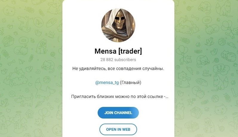 Mensa Trader закрыл свой основной канал, но уже создал несколько новых: Mensa_trader, mensa8 и MensaTrade, на которых снова раздает бесплатные сигналы, видна такая же накрутка аудитории и тот же аватар в виде маски. Покупать на них какие-либо «недооцененные» токены по наводке автора сообществ нельзя, это закончится только убытками.