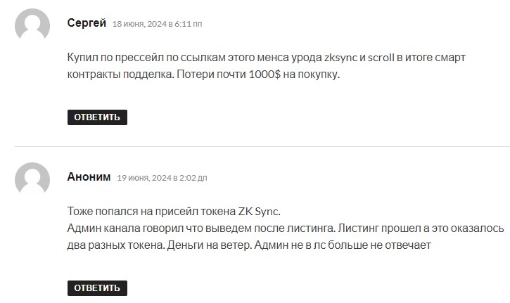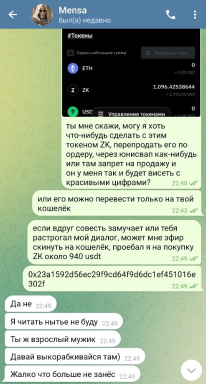 Сначала Mensa Трейдер рекламировал токены ZK, затем перешел на Scroll, позже начал писать о SEN. Все эти токены создавал сам, выставлял на бирже PancakeSwap и включал опцию запрета продажи. Подписчики покупали поддельные токены и не могли с ними ничего сделать. Отдавали за них реальную криптовалюту, а оставались с бесполезными фантиками на руках.