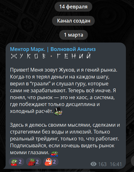 Телеграм проект Ментор Марк | Волновой анализ был создан 14 февраля 2025 года, но первые публикации появились только 1 марта. На данный момент на канале 10895 подписчика, просматриваемость постов – 20-25%. Но комментарии закрыты, обсуждения нет.
