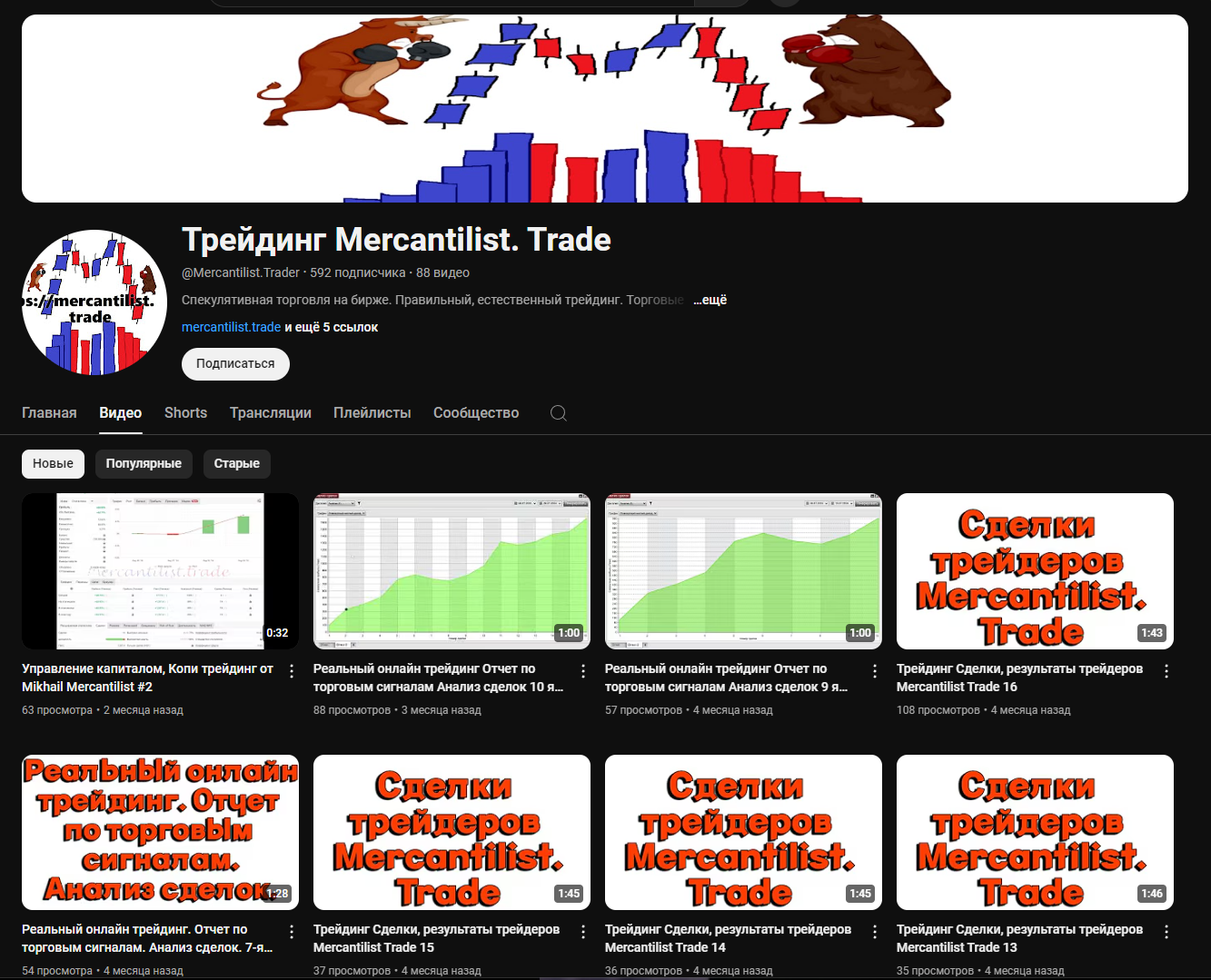 Ютуб-канал называет Трейдинг Mercantilis. Trade. Он был создан 29 ноября 2013 года. На него выложено всего 88 видео, которые в сумме набрали почти 50 тысяч просмотров. Контент выходит нерегулярно. Последняя запись выкладывалась 2 месяца назад. Просмотров на каждом отдельном видео обычно не более 100: