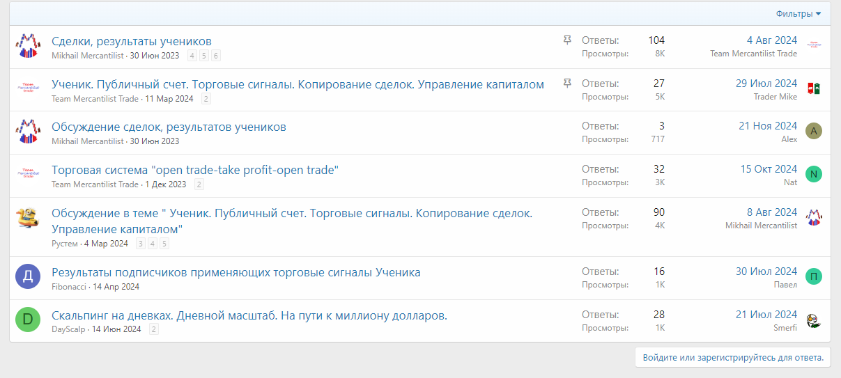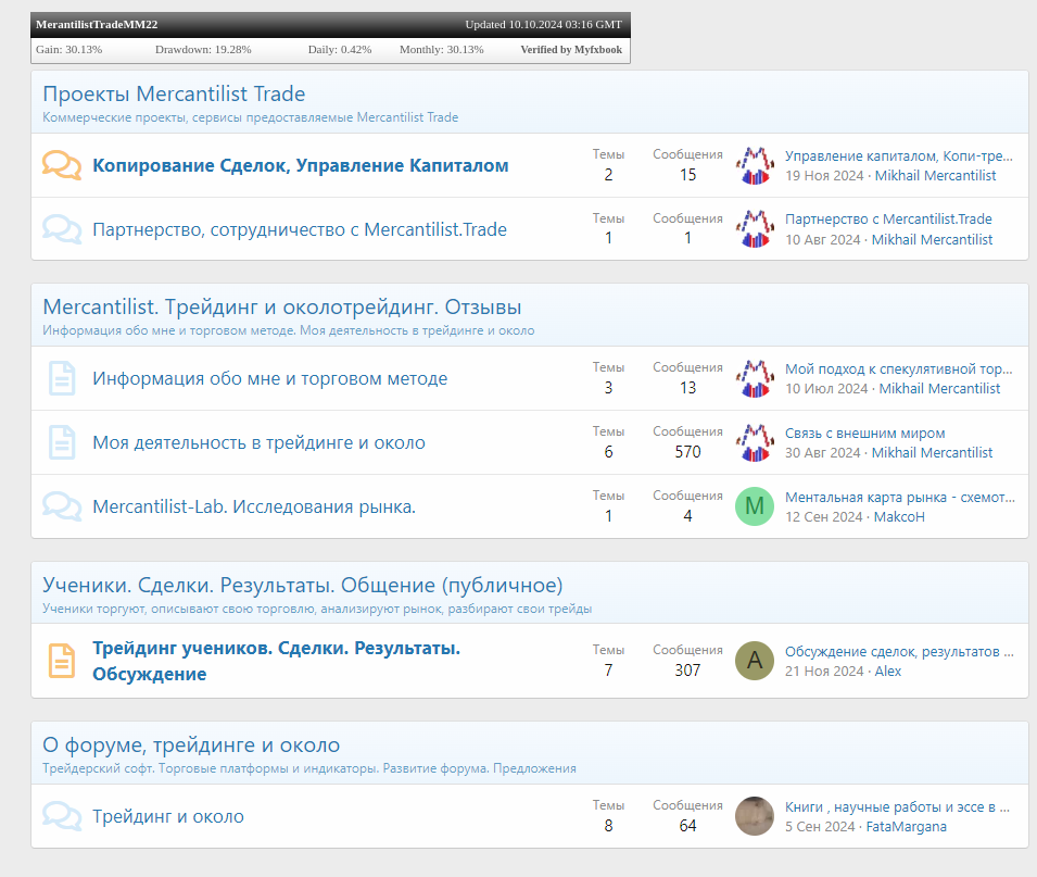 Здесь ничего особо интересного вы не найдете. Справедливости ради стоит отметить, что Михаил выставляет авторизованную статистику по своим сделкам на сайте https://www.myfxbook.com/members/MercantilistM/merantilisttrademm22/11134575. Минус в том, что она является достаточно устаревшей. Последнее обновление данных было 10 октября 2024 года.