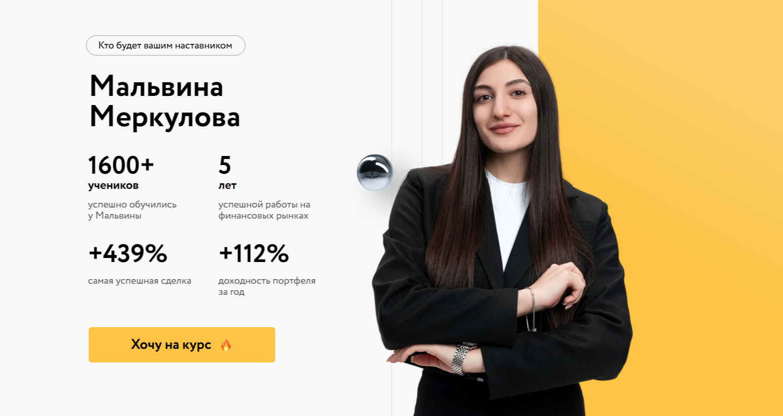 Сайт онлайн-школы MoneyFest знакомит посетителей с экспертом в мире инвестиций Мальвиной Меркуловой, у которой за плечами 5 лет успешной работы. За этот период данный преподаватель якобы обучил 1 600 учеников. За год доходность инвестиционного портфеля Марины выросла на +112%. Трейдер совершила самую успешную сделку с доходом +439%. Красивые слова не подкреплены фактами.