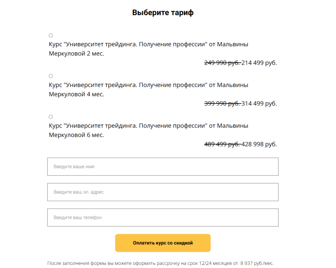 Покупка курса Мальвины Меркуловой доступна на официальном сайте онлайн-школы MoneyFest. Для приобретения обучающих материалов пользователю нужно нажать кнопку «Оплатить со скидкой», заполнить специальную форму и внести платеж. Будущим студентам Мальвины доступна рассрочка на 12-24 месяца. В рамках данной опции ежемесячный платеж будет составлять 8 937 рублей в месяц.