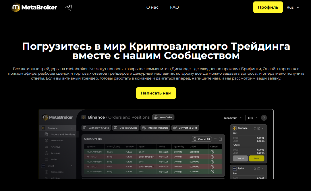 Клиенты брокерского сервиса могут перейти к персональному дневнику, скринеру MetaMarket, странице с турнирами. Через личный кабинет также можно попасть в закрытое комьюнити, которое находится в сети Дискорд. Тут каждый день проводятся брифинги для пользователей, разборы сделок, сессии онлайн.