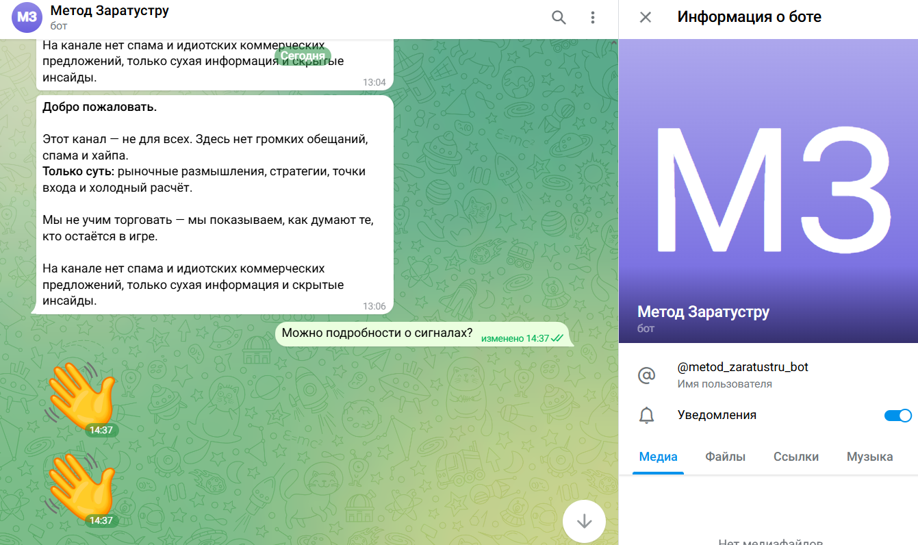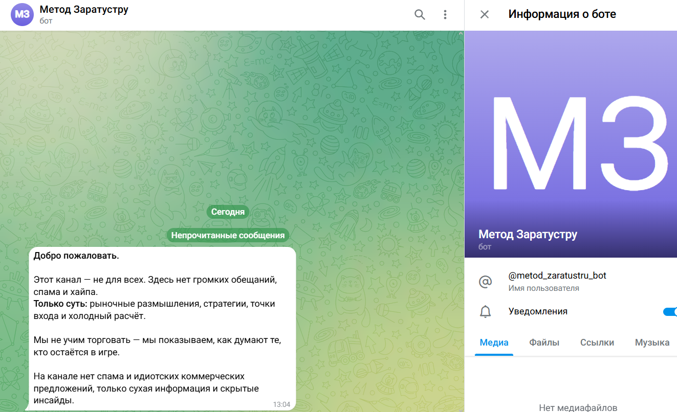 С другой стороны автор анонимен, статистики по сделкам нет, а некоторые посты напоминают мягкий пиар малоизвестных токенов. Отзывов нет, а бот @metod_zaratustru_bot пока выполняет роль дверного звонка, а не помощника.