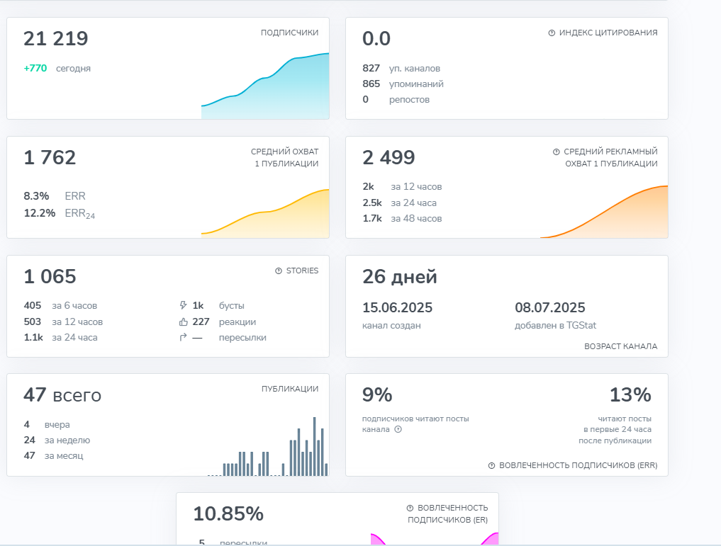 - Устойчивый уровень вовлеченности: ERR 10.85% и 13% реакций в первые сутки после публикации.