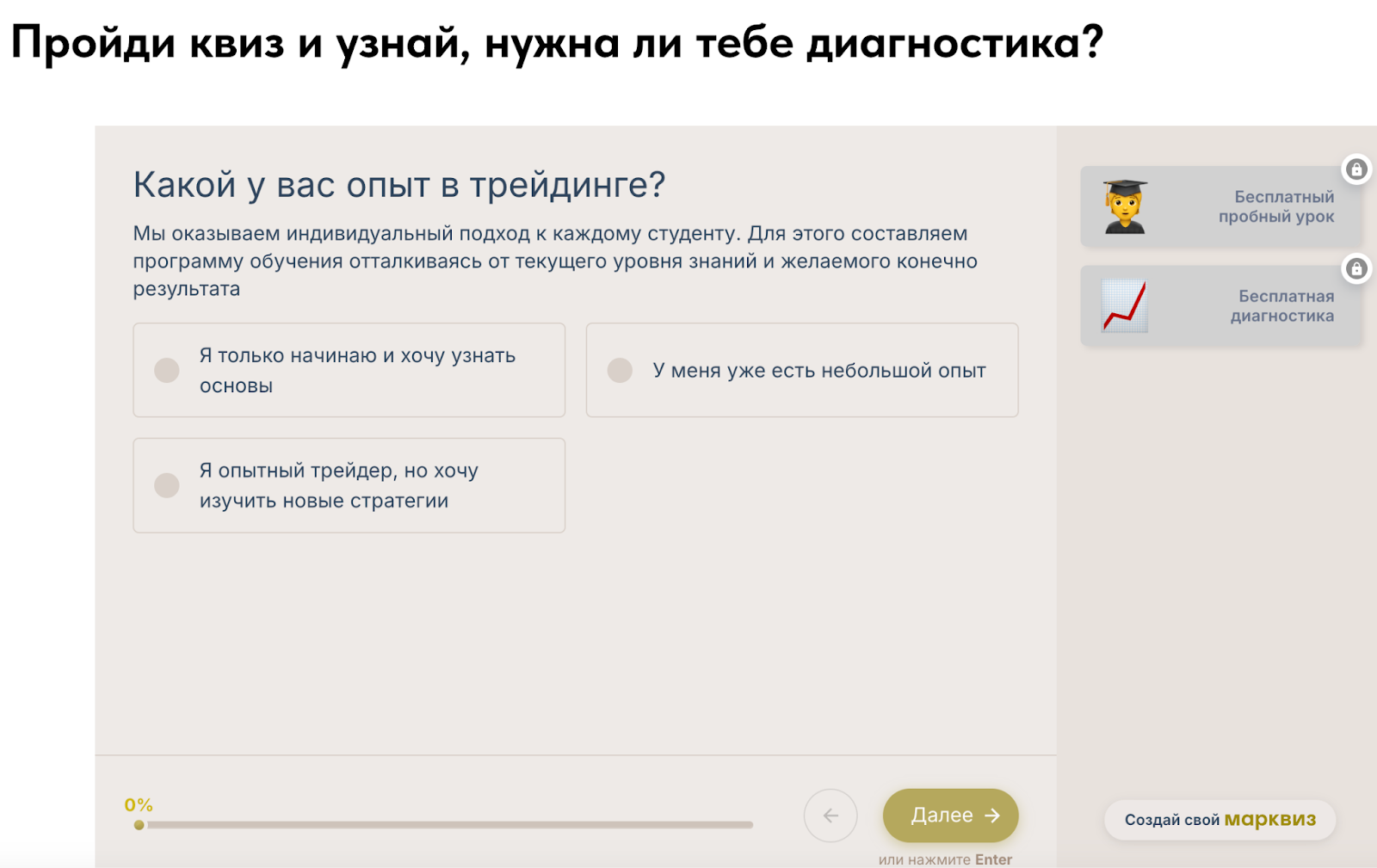 Для новых клиентов доступны сразу две бесплатные услуги: пробный урок и прохождение диагностики. Для получения пробного урока пользователю необходимо указать свое имя и контактные данные для связи в онлайн-заявке.Для получения персональных рекомендаций на пробном уроке каждый новичок может пройти диагностику в виде квиза из трех вопросов и после этого записаться на пробный урок.