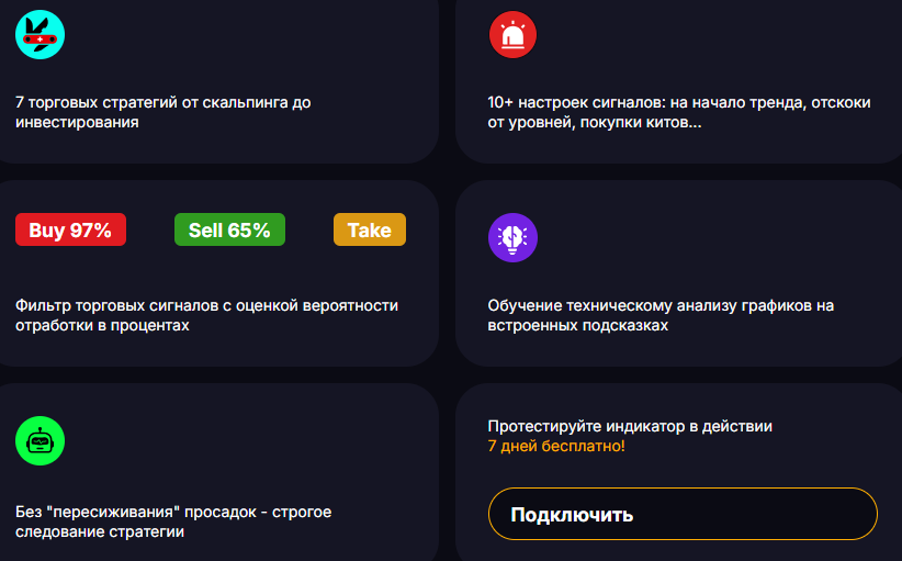 Создатели индикатора рассказывают о продвинутых технологиях, на которых он построен, утверждают, что он стабильно приносит прибыль. Но при этом не могут ничего подтвердить: на их сайте или в каналах нет убедительных отчетов по итогам сделок на дистанции.