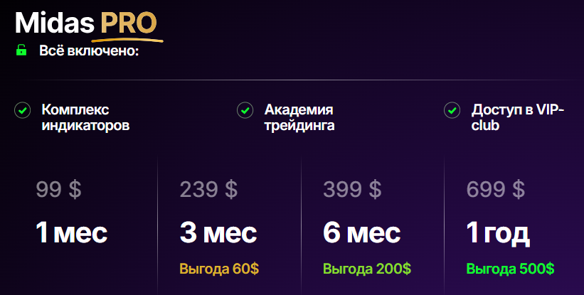 Индикатор Мидас распространяется по платной временной подписке, которая стоит от $99 за месяц до $699 за год, навсегда купить его нельзя. Также есть бесплатный пробный период в течение 7 дней. При покупке платной версии дополнительно обещают подписку на закрытый VIP-клуб и обучение в академии трейдинга.