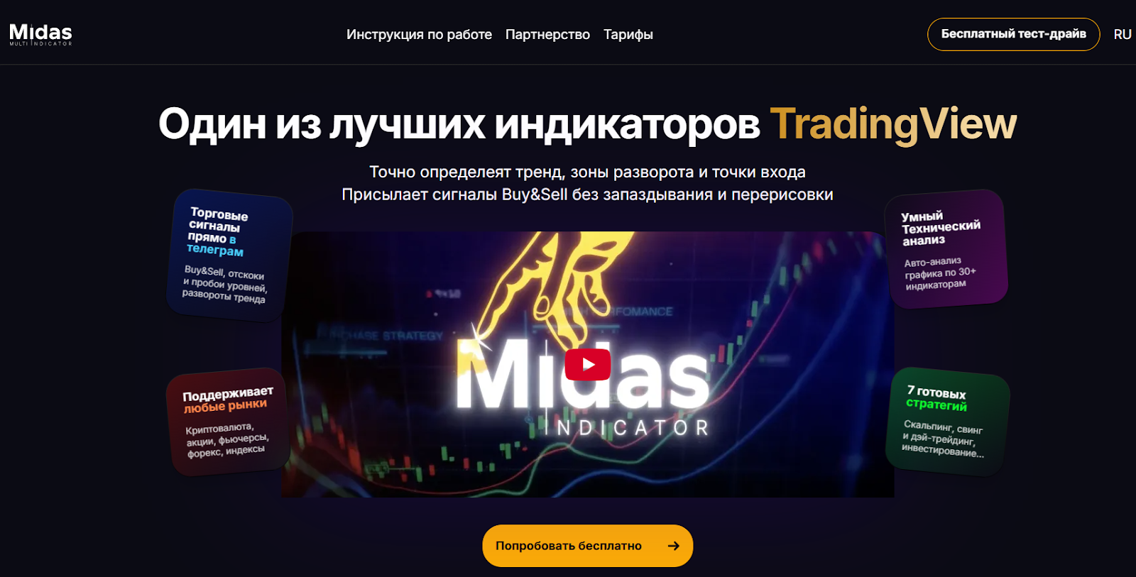 Индикатор Midas начали предлагать в середине 2024 года. Его создали неизвестные, которые назвали его “швейцарским ножом” для трейдинга. Он якобы представляет собой торговую стратегию из 50 самых результативных индикаторов технического анализа.