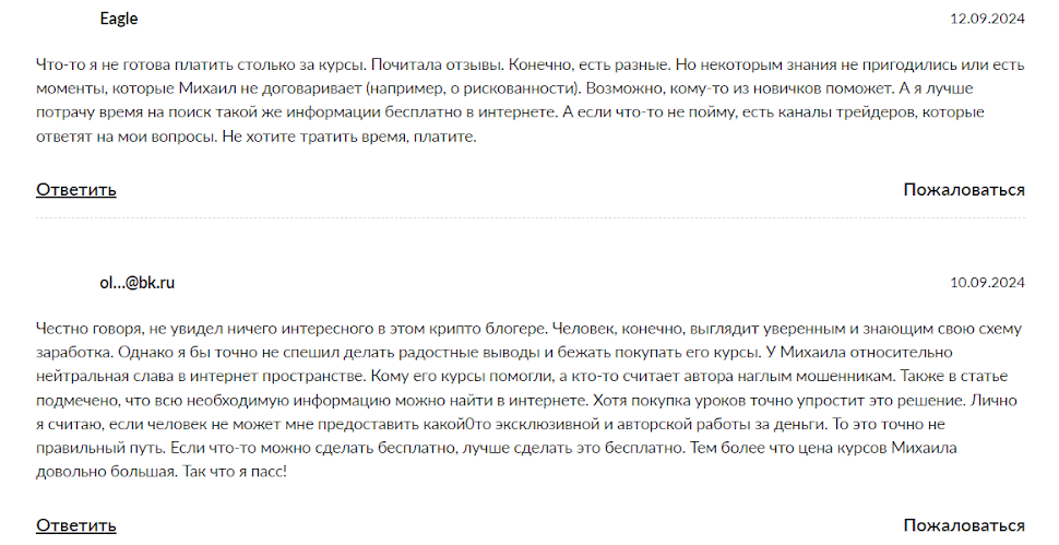 Отзывы о Михаиле двоякие: некоторые клиенты отмечают полезность информации, другие недовольны стоимостью и качеством консультаций, а также недостаточным упоминанием рисков. Мы рекомендуем тщательнее проверять базовую информацию о якобы опытном трейдере перед сотрудничеством.