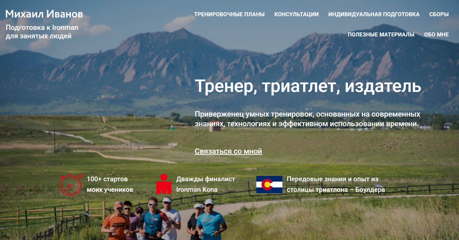 Здесь тренер, триатлет, издатель Михаил Иванов продвигает собственные услуги и описывает их плюсы. На сайте можно почитать о правилах самостоятельной подготовки к триатлону и получить больше информации об этом виде спорта. В нижней части есть ссылки на социальные сети и контакты автора.