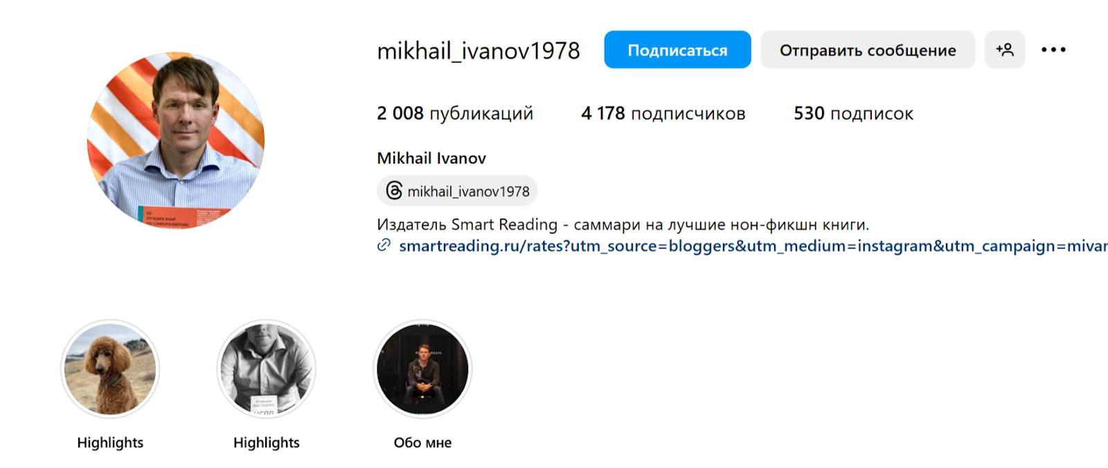 Страницу в Инстаграм можно найти по ссылке mikhail ivanov1978. Здесь герой материала сумел собрать немалую аудиторию — около 4.2 тыс. человек. При этом он разместил свыше 2000 записей. Здесь есть краткая информация о герое материала. Он выделяет, что является издателем Smart Reading и участвовал в финале Ironman на коне.