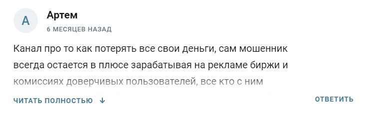 Основной источник дохода Михаила — это реферальные ссылки на биржу Bingx. Он регулярно публикует сигналы для сделок, но без стоп-лоссов, что повышает риск убытков. Отзывы на канале YouTube и Телеграм заблокированы, что затрудняет получение обратной связи от пользователей и вызывает подозрения в прозрачности.