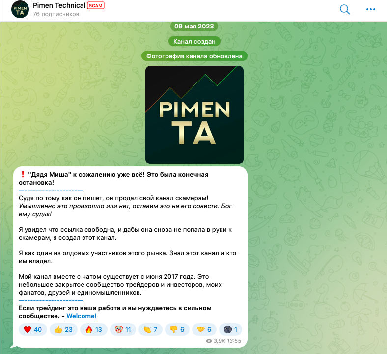 Телеграм канал Михаил Пименов (pimen technicalanalysis 7302) являлся основным медийным ресурсом трейдера. В 2023 году он был продан. Имеется информация, что его использовали мошенники, за что он получил отметку Scam от администрации ТГ. Точно узнать, как именно развивались события, уже практически невозможно. Но можно изучить, что сейчас из себя представляет ресурс, созданный когда-то Михаилом.