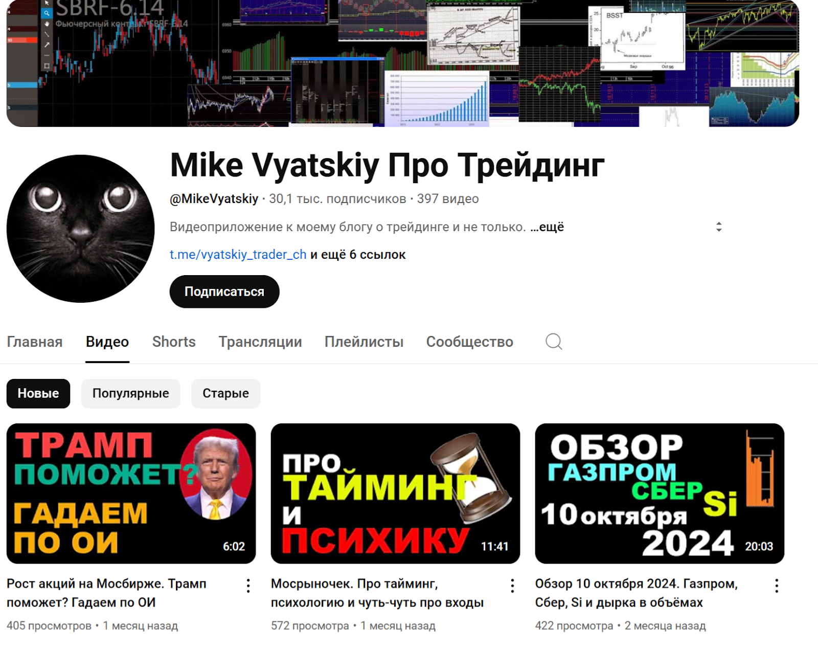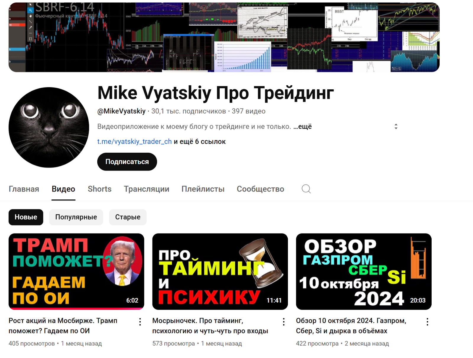 Есть также канал MikeVyatskiy в Ютубе. В отличие от рассмотренных выше проектов, сообщество Mike Vyatskiy Про Трейдинг собрало около 30 тыс. В них автор рассказывает об устройстве рынка, вариантах анализа, психологии и т. д. Общее количество просмотров — свыше 2.2 млн, что является весьма солидным показателем.